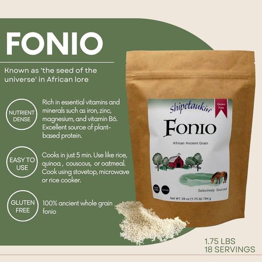 Fonio is a nutrient-rich, gluten-free grain from West Africa, high in fiber, protein, and essential minerals. Its fiber content promotes digestive health, while its low glycemic index helps manage blood sugar levels, making it suitable for people with diabetes. Fonio is a good source of B vitamins and amino acids like methionine and cysteine, often lacking in other grains. These nutrients support energy production, metabolism, and muscle function. Additionally, its versatility in cooking and high mineral content contribute to bone health and overall wellness.